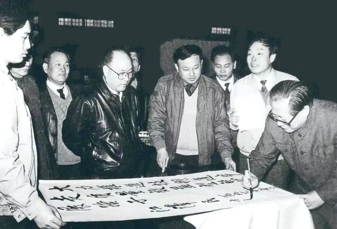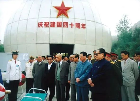 1989年9月,江泽民等党和国家领导人一起来到北京小汤山沙河机场参加展览,在哈尔滨玻璃钢研究院研制的17米 L波段雷达天线罩前参观并留影。