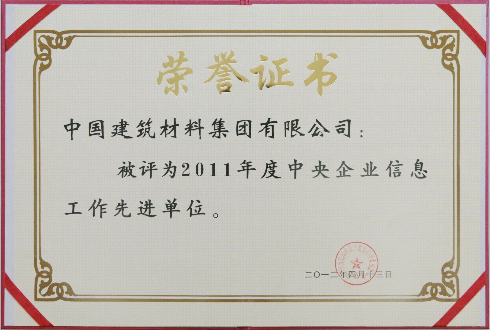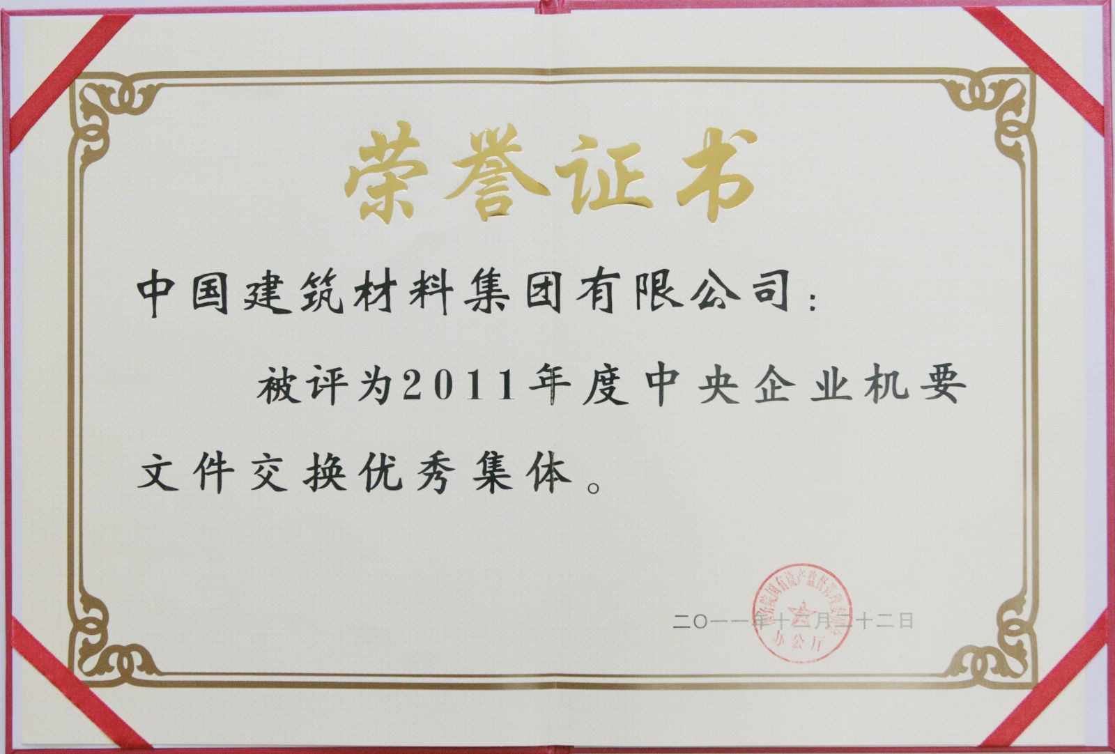 日前,集团公司办公室因2011年度公文、信息、机要文件交换等工作成绩突出,获国务院国资委多项荣誉称号。集团公司被评为2011年度中央企业信息工作先进单位、2011年度中央企业机要文件交换优秀集体、2011年度中央企业报送公文无差错企业。因工作出色,集团公司办公室卢洪同志被评为2011年度中央企业机要文件交换优秀交换员称号,张静同志被评为2011年度中央企业信息工作先进个人称号。此外,集团公司的视频会议、档案管理等工作也受到国资委相关部门的表扬。