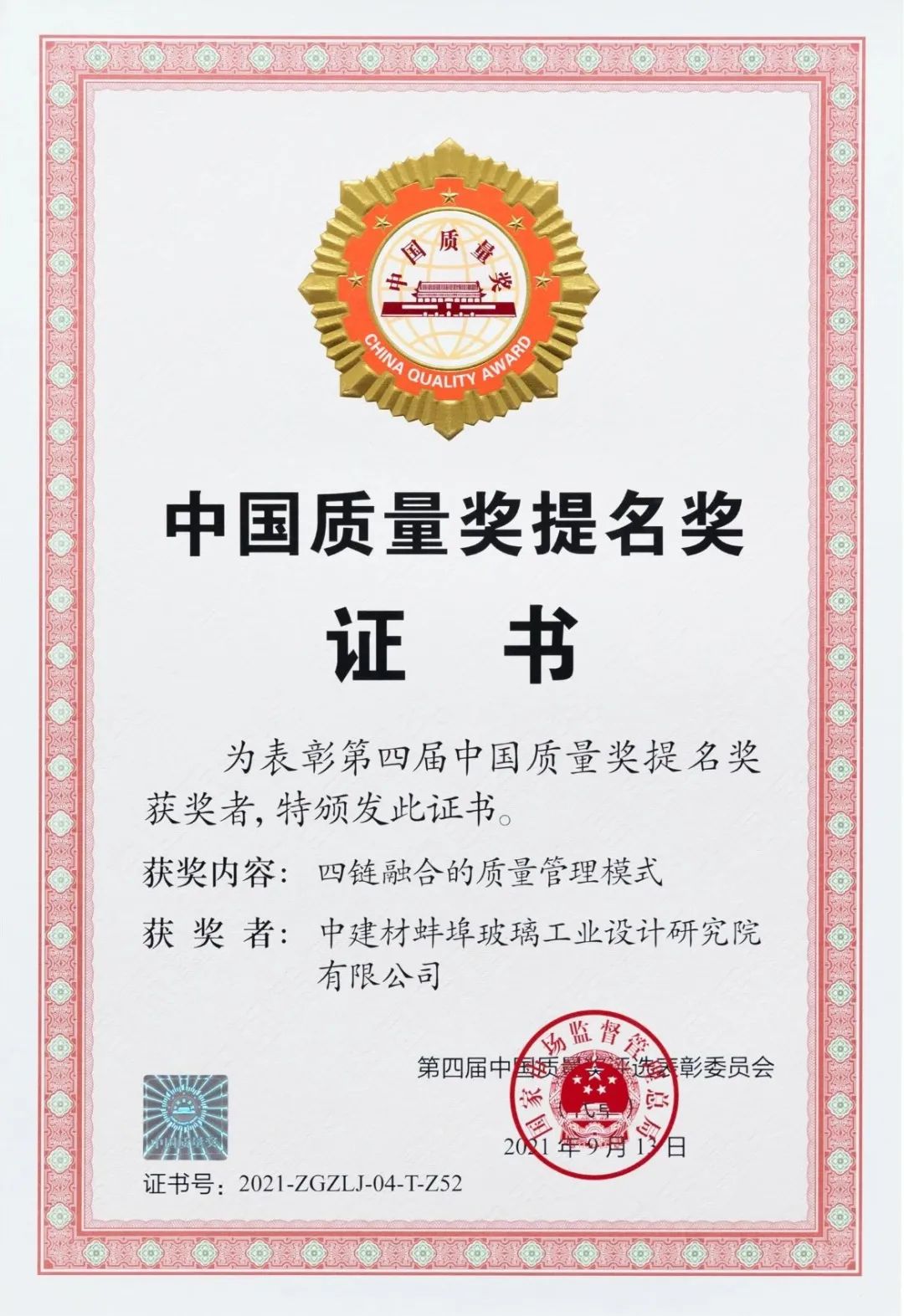 蚌埠玻璃院和南京玻纤院荣获“第四届中国质量奖提名奖”