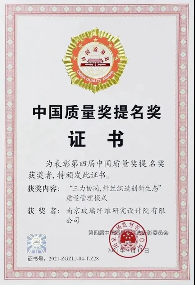 第四届中国质量奖首次在中国质量大会上颁发,该奖项是在各地区各行业广泛推荐基础上,经中国质量奖评选表彰委员会评选,市场监管总局审定并核报国务院批准产生的。集团所属中建材蚌埠玻璃工业设计研究院与南京玻纤院从近700个组织中脱颖而出,斩获“第四届中国质量奖提名奖”,实现了企业在中国质量领域最高荣誉的突破。