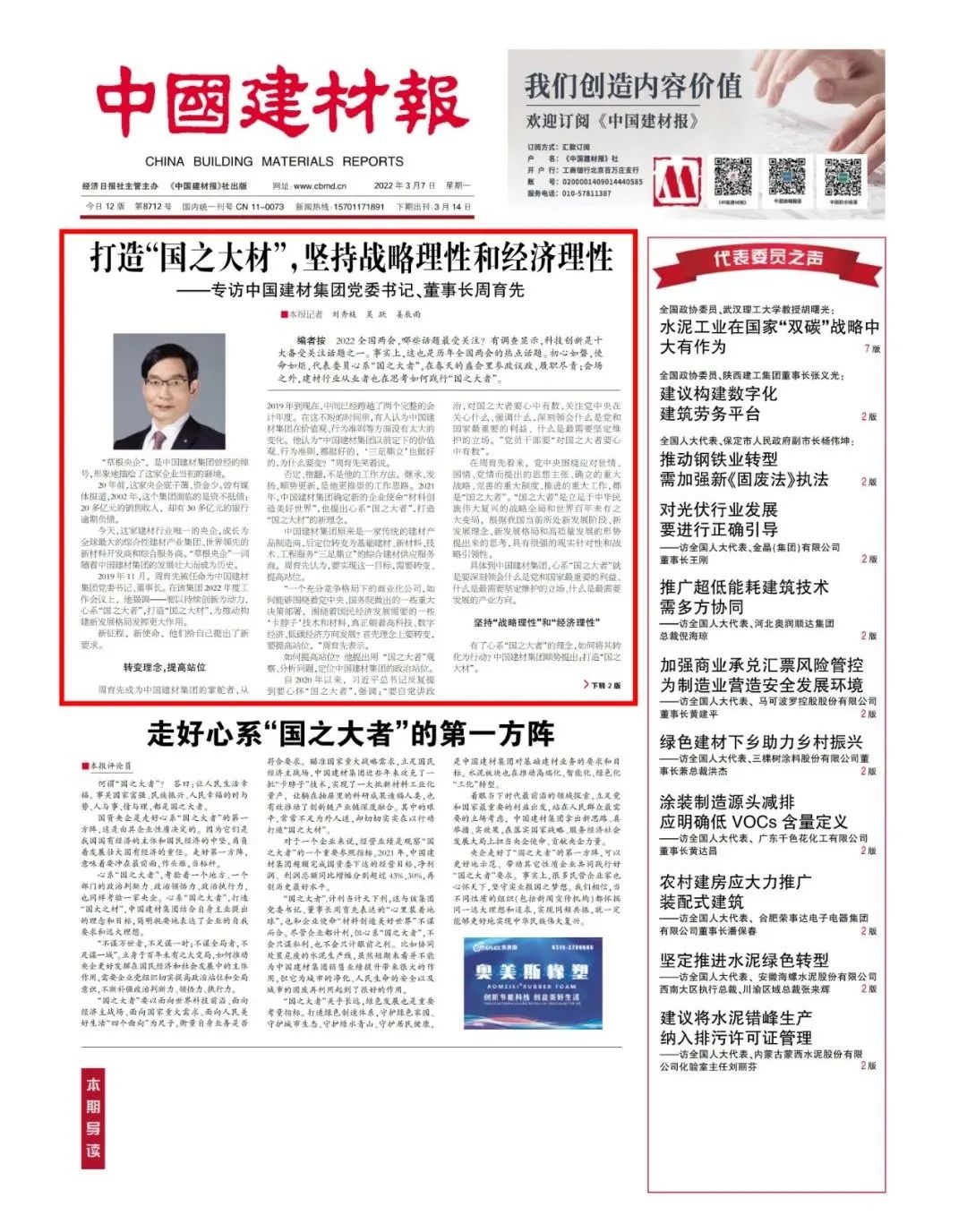 来源:中国建材报 发布时间:2022-03-09编者按 2022年全国两会,哪些话题最受关注?有调查显示,科技创新是十大备受关注话题之一。事实上,这也是历年全国两会的热点话题。初心如磐,使命如炬,代表委员心系“国之大者”,在春天的盛会里参政议政,履职尽责;会场之外,建材行业从业者也在思考如何践行“国之大者”。近日,《中国建材报》专访日韩无码 党委书记、董事长周育先。