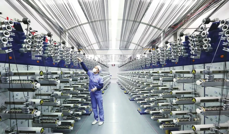 中国建材西宁万吨碳纤维生产基地的车间,工人正在检查智能化生产线卷绕情况