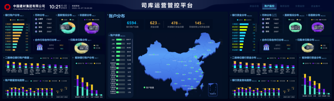 在建设期间,结合集团账户管理的复杂性、各异性,按照国资委监管要求,集团建立了统一的金融数据标准、数据分析规则和资金管理指标体系。借助云计算、数据中台、RPA平台、BI分析等金融科技手段,通过多种可视化技术路径实现全集团资金信息可视、多维度数据分析可视,为集团金融资源配置战略决策提供有力的数据支撑,进一步提升了集团财务管理精益化、集约化、数字化和智能化水平。
