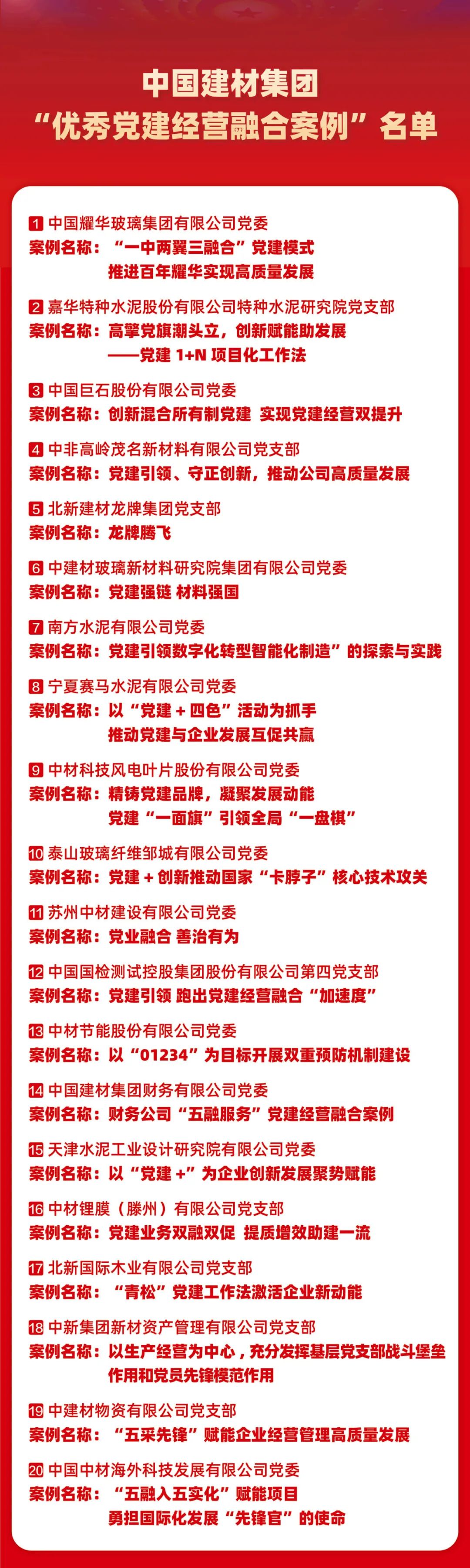 会上,发布了集团党建经营融合“十佳案例”“优秀案例”,展播了凯盛科技、泰山石膏、瑞泰马钢案例视频,中材国际、中材科技、古浪祁连山等三家获奖企业代表作经验交流。