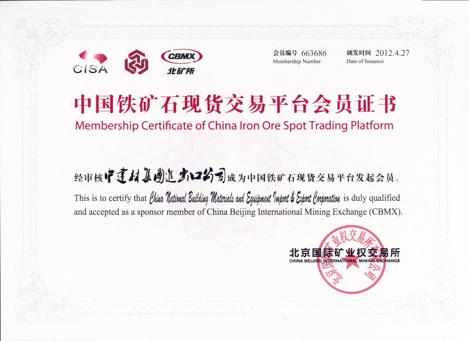 4月27日,中国铁矿石现货交易平台发起会员证书颁发仪式在北京国际矿业权交易所交易大厅举行。中建材进出口获得“中国铁矿石现货交易平台发起会员”证书。