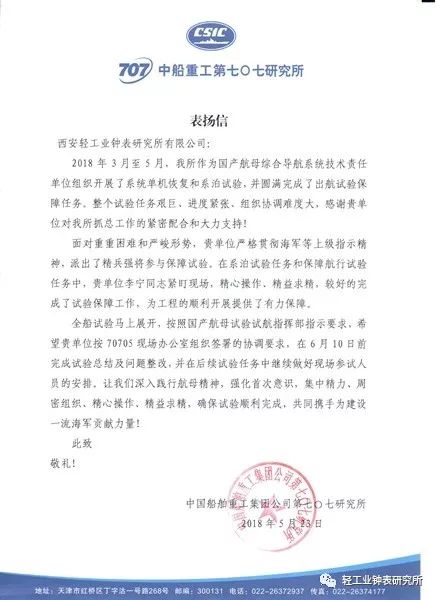 来源:中国建筑材料科学研究总院 发布时间:2018-05-305月23日,钟表所接到中国船舶重工集团公司第七〇七研究所发来的表扬信,对钟表所GJSM-ⅠB型高精度石英母子钟助力保障我国第一艘国产航母首次海上试验任务表示感谢。