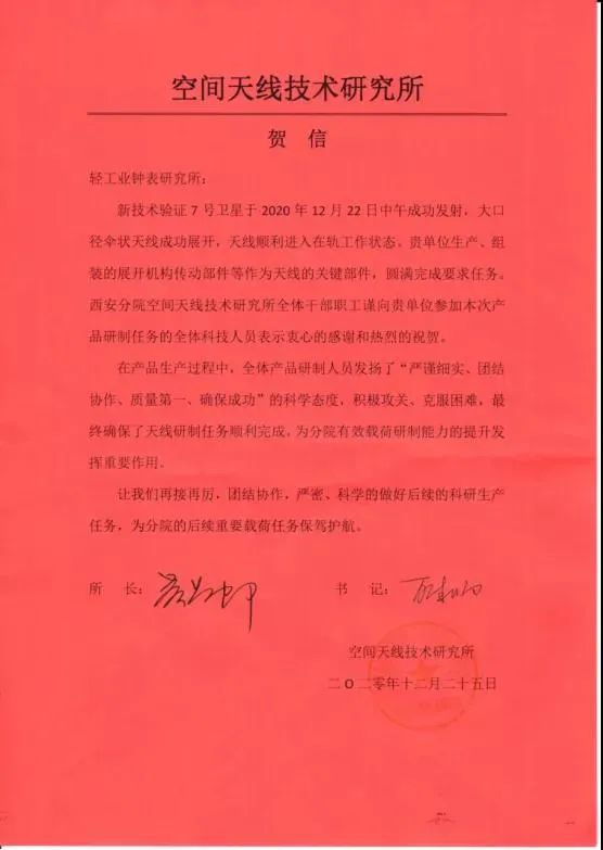 西安钟表所收到空间天线技术研究所贺信