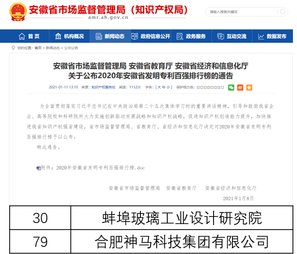 日前,安徽省市场监督管理局、教育厅、经济和信息化厅联合公布了2020年安徽省发明专利百强排行榜,凯盛科技所属蚌埠玻璃工业设计研究院和合肥神马科技有限公司分列30名和79名。安徽省发明专利百强是安徽省企业科技创新大军的第一方阵,专利百强排行榜的揭晓,将发挥良好的示范作用,引导广大企业重视知识产权创造、应用和保护,不断增强企业的核心竞争力。
