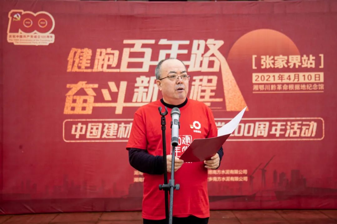 南方水泥党委常委、执行副总裁,湖南南方党委书记、总裁吕文斌致辞。他讲到,张家界是革命老区,红色底蕴深厚。1934年,红二、六军团发动湘西攻势,建立了湘鄂川黔省委、省革委、省军区,开创了湘鄂川黔革命根据地,在中国人民革命斗争史上写下了光辉灿烂的一页。站在革命先辈们曾经战斗过的地方,仰望不朽丰碑,感怀峥嵘岁月,民族自豪感油然而生。广大党员职工一定要坚定理想信念,牢记初心使命,将红色基因转化为干事创业的动力,在新时代高质量发展征程中奋发有为担重任,矢志不渝再出发,为助力加快打造成为具有全球竞争力的世界一流材料产业投资集团,为实现中华民族伟大复兴的中国梦贡献力量,以良好的精神风貌和优异的经营业绩庆祝建党100周年。