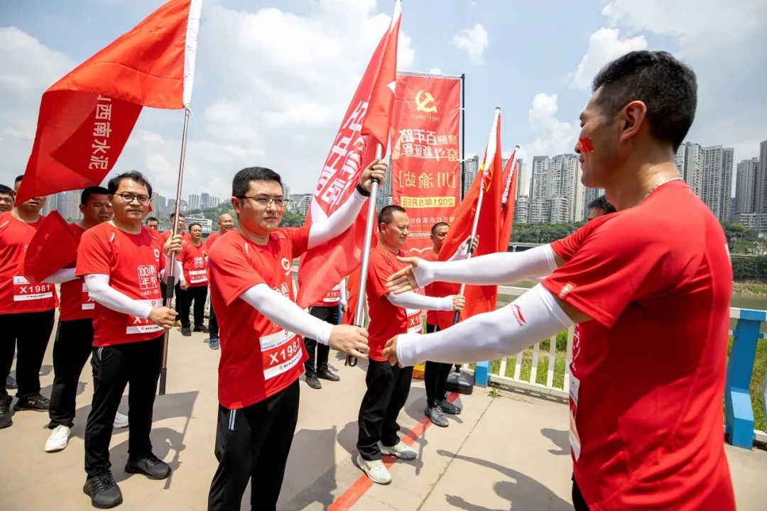 健跑在11点06分正式开始,以1921年、1949年、1978年、2012年和2021年5个年份标识将健跑路线分为4段,四川总队从“1921年”跑向“1949年”,在“1949年”处,将党旗交给安县中联,安县中联从“1949年”奔向“1978年”,重庆秀山接棒,从“1978年”向“2012年”冲去,最后在“2012年”处,三家单位100名选手会师后,共同跨越“2021年”向美好的未来冲刺,寓意一代又一代的中国建材人团结协作,为实现中华民族伟大复兴的中国梦接续奋斗!