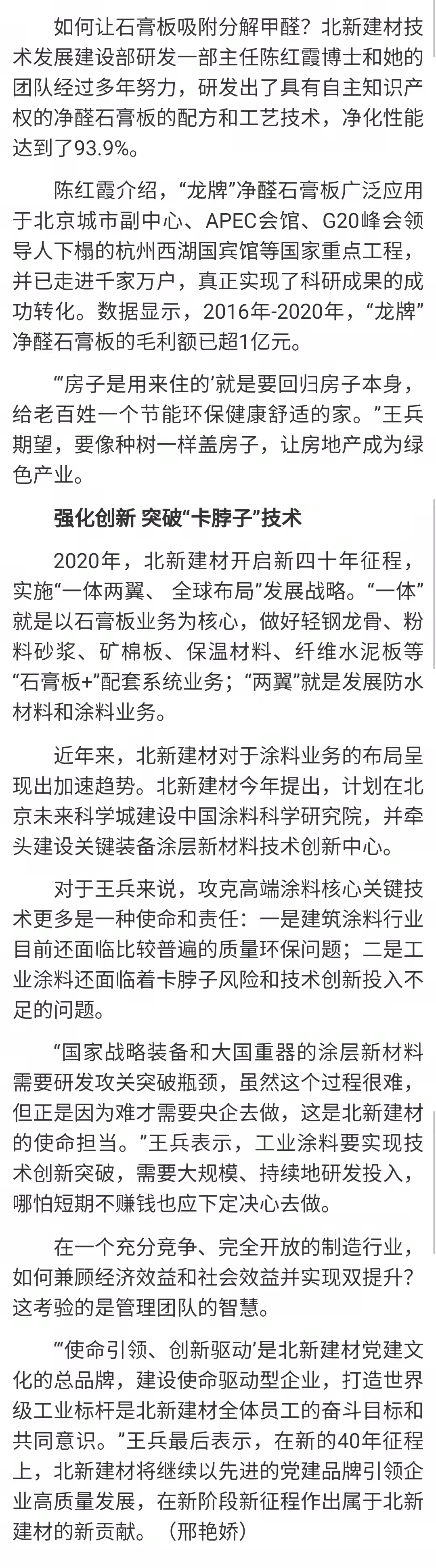 二是围绕“卡脖子”工程。作为中央企业日韩无码 的新型建材业务板块,北新建材凭借全球最大石膏板企业的已有产业优势,积极布局防水、涂料业务,希望能够推动解决建筑渗漏防水痛点,推动国产涂料品牌复兴,让中国的老百姓住上不漏水、无甲醛污染的好房子,推动相关行业高质量发展。