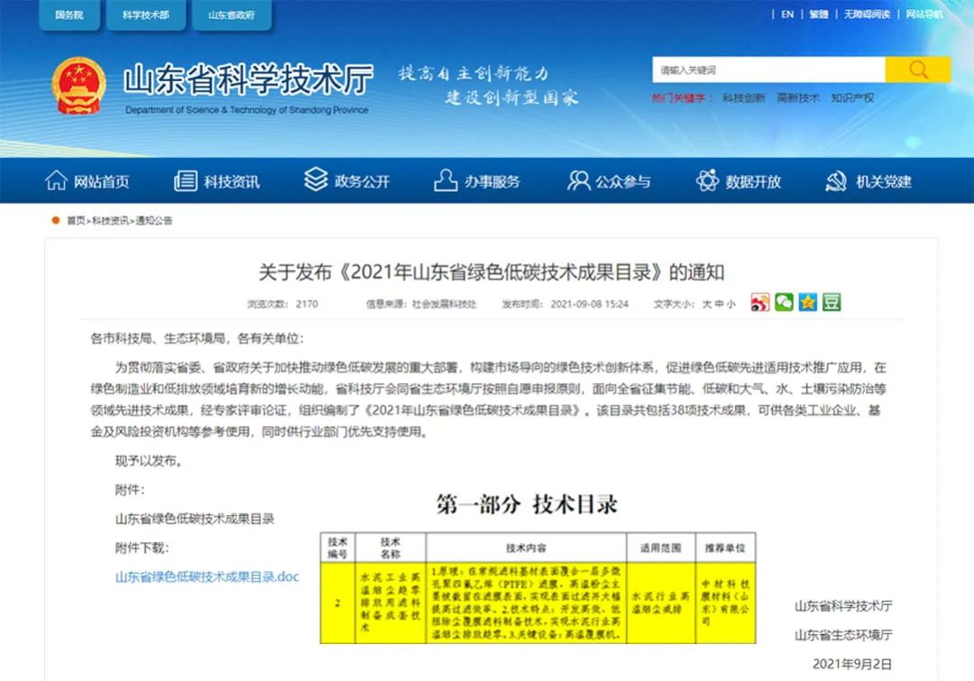 06 中材科技膜材料(山东)有限公司覆膜滤料技术成功列入《2021年山东省绿色低碳技术成果目录》