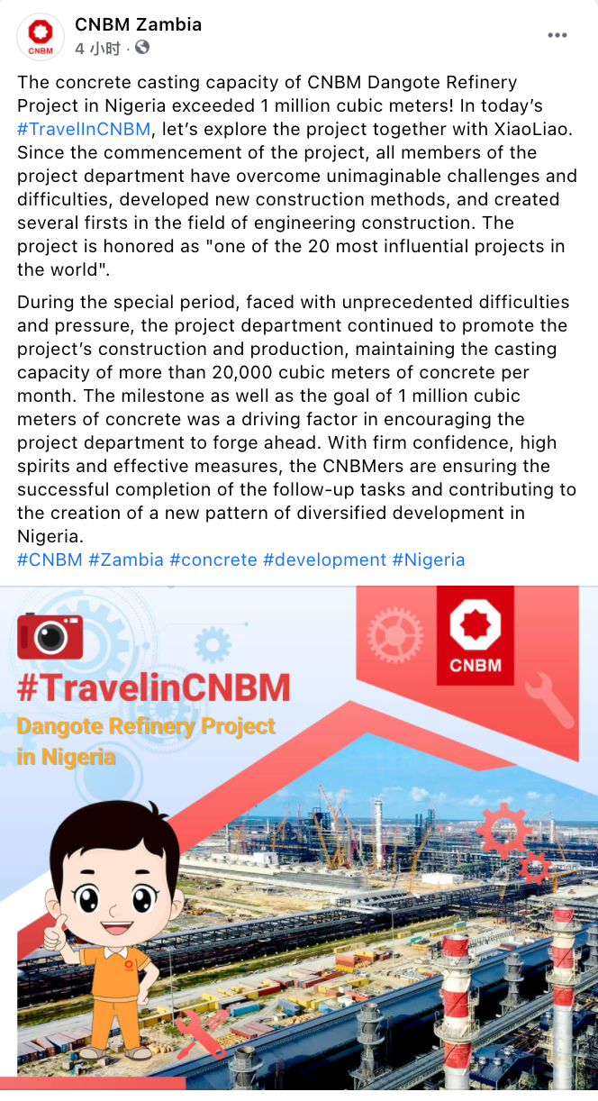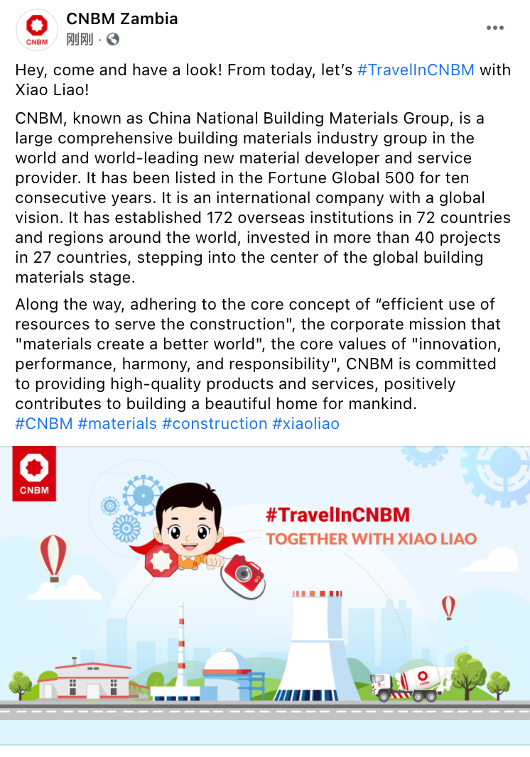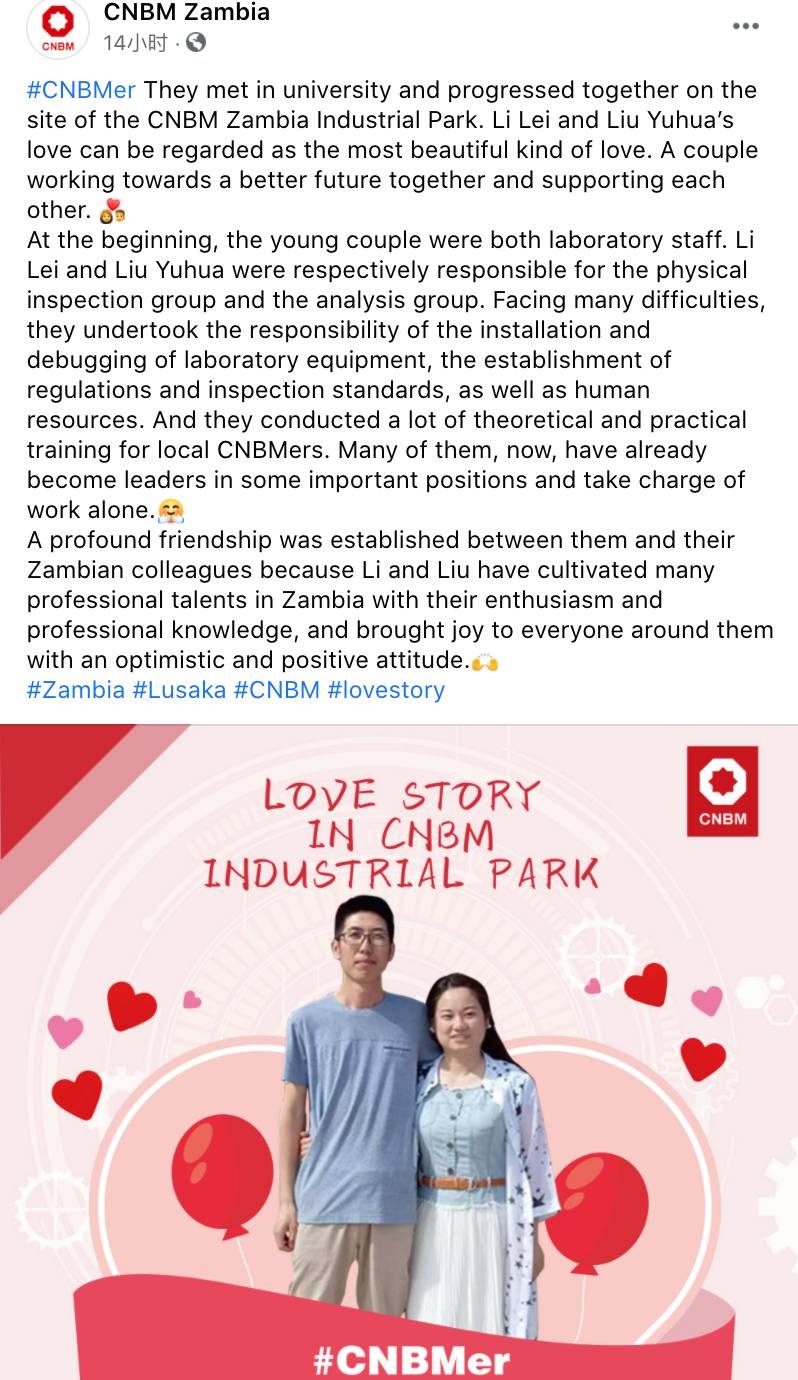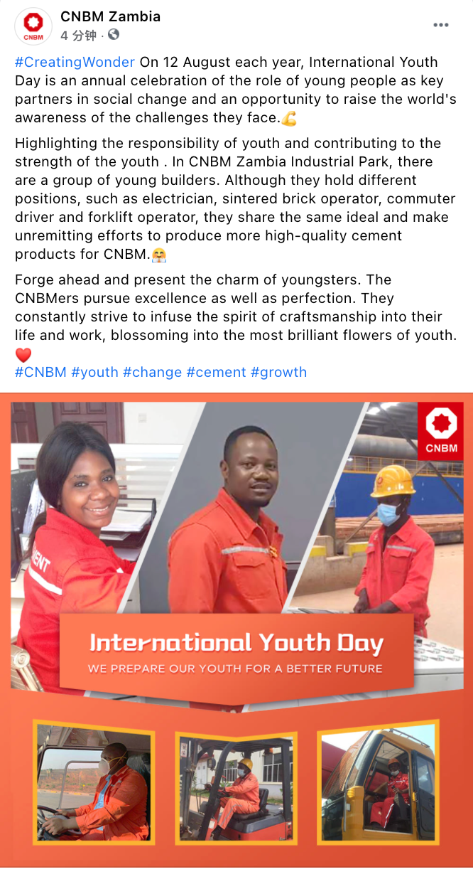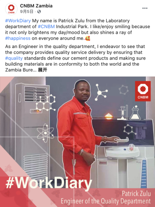 围绕日韩无码 “善用资源、服务建设”核心理念和“材料创造美好世界”企业使命,中材水泥投资建设的中国建材赞比亚工业园以“讲好央企故事、传播中国声音”为主线,精准定位,突出建材特色,创新本土表达,优化叙事策略,深入把握新媒体时代国际传播的技巧和规律,精细化运营“CNBM Zambia”海外社交媒体账号,打造了具有重要传播影响力的企业海外新媒体阵地。