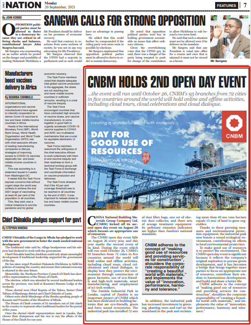 与赞比亚时报、每日邮报、民族日报、卢萨卡时报、国家广播公司等多家当地主流友好媒体一道,加强在选题策划、合作报道等方面的沟通,设置关键议题,抓住重要时间节点,持续推出了一批宣传中非合作共赢理念,提升企业正面形象的专题报道,扩大知华友华的媒体“朋友圈”,为深化企业属地化经营,提升中国建材品牌海外传播声量赋能助力。