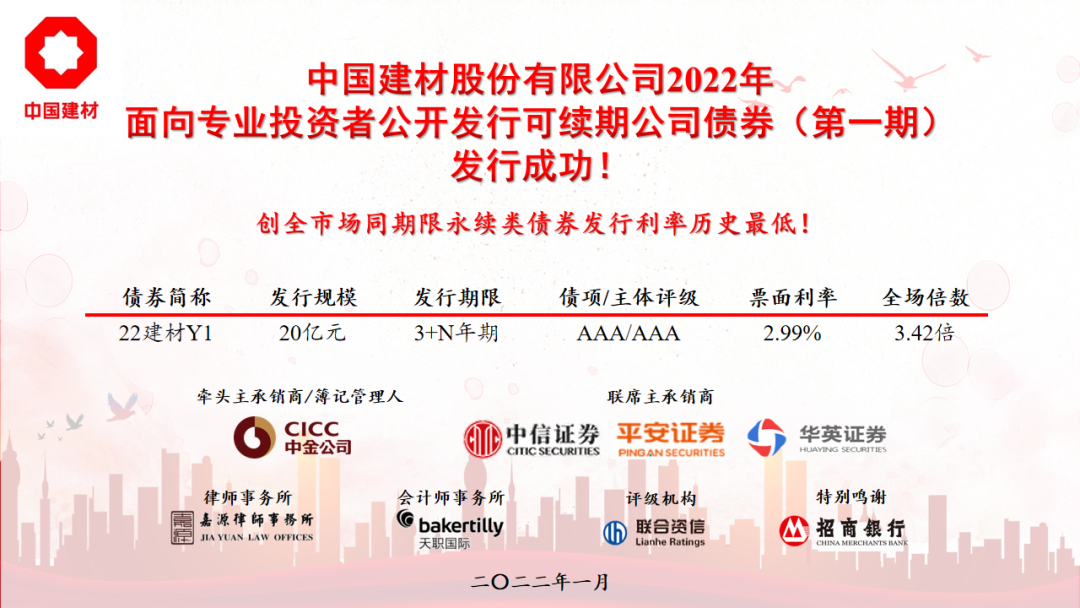 继1月13日中国建材股份有限公司(简称“中国建材股份”)发行公司新低3年期中期票据后,公司精准预判,抓住市场机会,于1月17日,又成功发行了20亿元可续期公司债券,期限3+N年,全场认购倍数超3倍,票面利率2.99%,是有史以来全市场同期限永续类债券利率最低纪录!是公司永续类债券利率历史新低!
