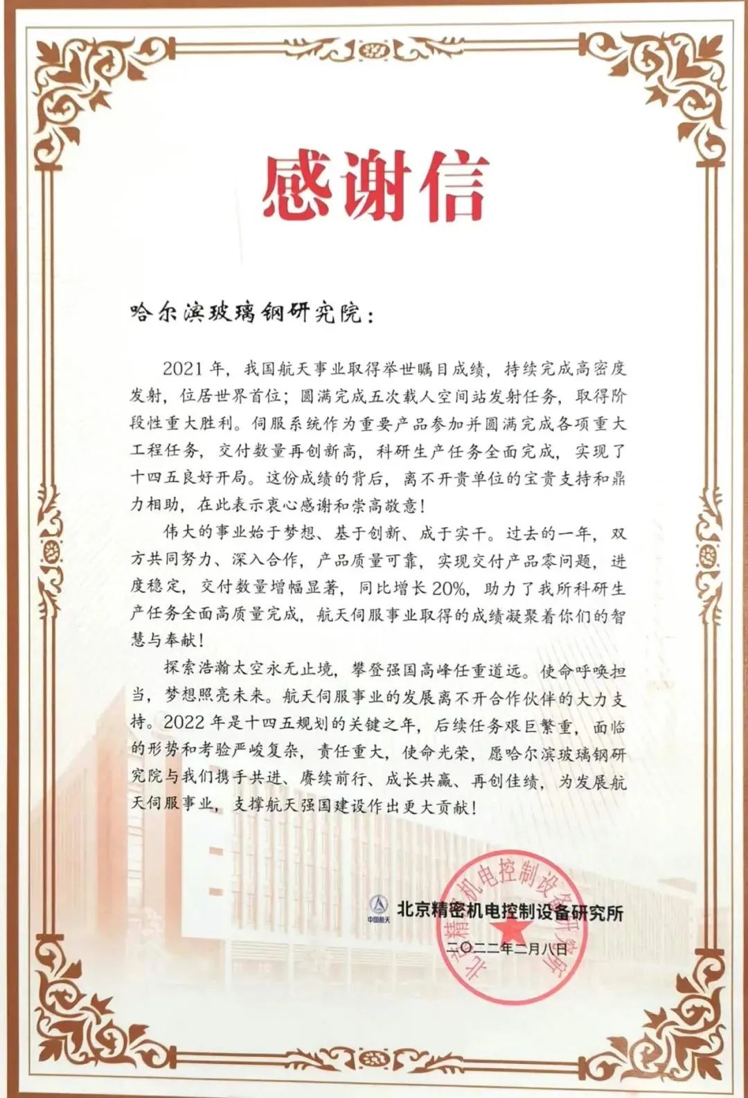 北京精密机电控制设备研究所向哈玻院发来感谢信