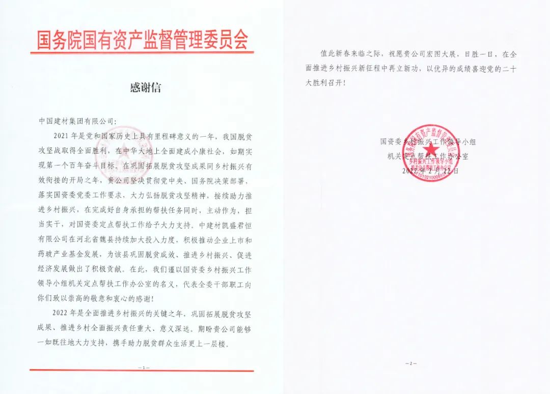 凯盛君恒聚力乡村振兴获国资委感谢信