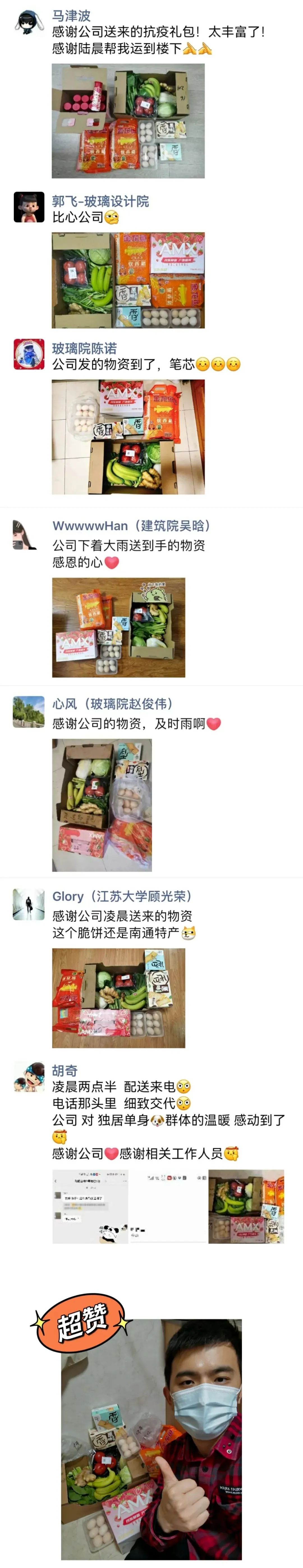 中国建材工程党委第一时间响应普陀区委组织部号召,开展爱心物资捐赠行动,为普陀区孤寡老人以及生活困难家庭无偿捐赠1000份肉蛋蔬菜爱心礼包。以人为本,关爱员工,保障在沪困难员工物资供应。公司竭尽全力保障封控区员工生活物资供应,多部门协调配合为公司在沪困难员工配送爱心物资。收到公司爱心大礼包的员工纷纷发朋友圈晒图,表达收到物资的喜悦和对公司关怀的感激。