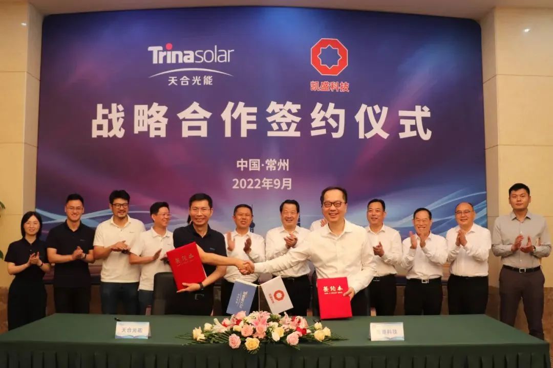 9月2日,凯盛科技集团与天合光能股份有限公司签署全面战略合作协议,双方将进一步深化在太阳能领域供应链、产业链、创新链的协同,以实际行动践行国家“双碳”战略。本次战略合作是战略所需、市场所需、发展所需。天合光能将把技术优势、产业优势与凯盛的资源优势、材料优势充分结合,进一步深化拓展前期合作事项,积极拓展创新链、布局产业链、构建产业群,在充分把握时间性、经济性中,共同打造新能源、新材料的产业发展高地、联合创新高地,努力让中国新能源、新材料品牌享誉世界。