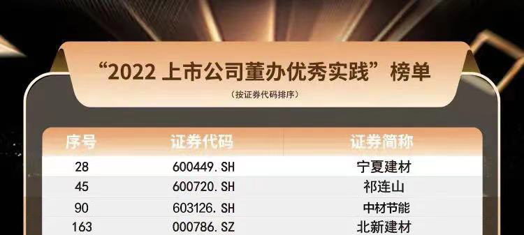 近日,中国上市公司协会发布“2022上市公司董办最佳实践”及“2022上市公司董办优秀实践”榜单。集团所属中国建材股份(03323.HK)、天山股份(000877.SZ)、中国巨石(600176.SH)、中材国际(600970.SH)荣获2022上市公司董办最佳实践奖,所属上市公司宁夏建材(600449.SH)、祁连山(600720.SH)、中材节能(603126.SH )及北新建材(000786.SZ)荣获2022上市公司董办优秀实践奖。
