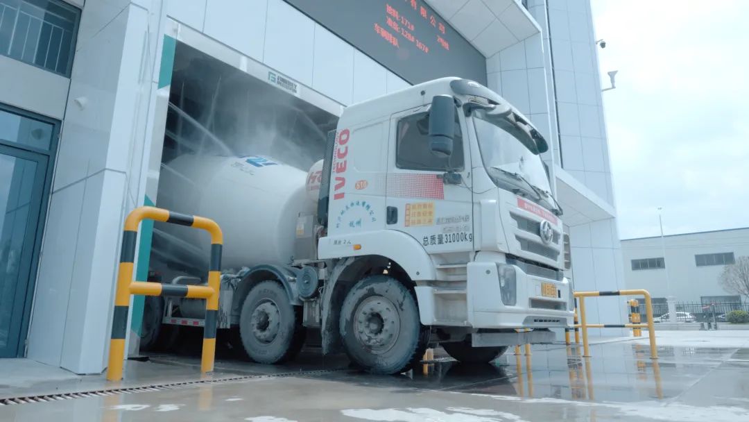 更方便的体验感还在于,他一上车,系统已提醒他混凝土装料完成。挪车些许,周边的26个喷淋头同时启动,为刚完成装料的搅拌车轮胎、车身、尾斗进行全方位“淋浴”。