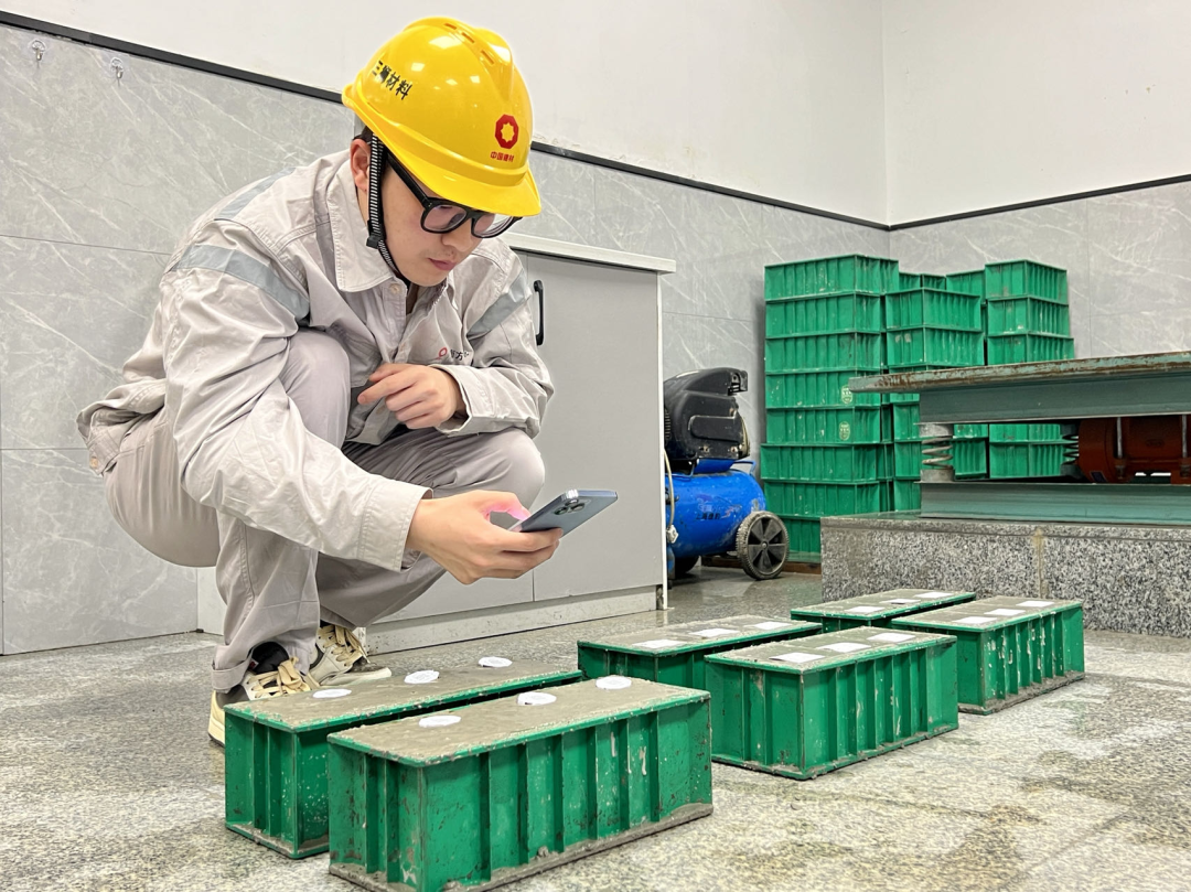 “该试块二维码系统由我们三狮材料自主开发,工艺员取样时拍照获取当前混凝土信息,并按照塌落度扩展度实验的结果按需制作试块,生成打印标签。同时,从取样到送检,全过程留痕的标准化操作也确保了试块数据的实时性和真实性。”