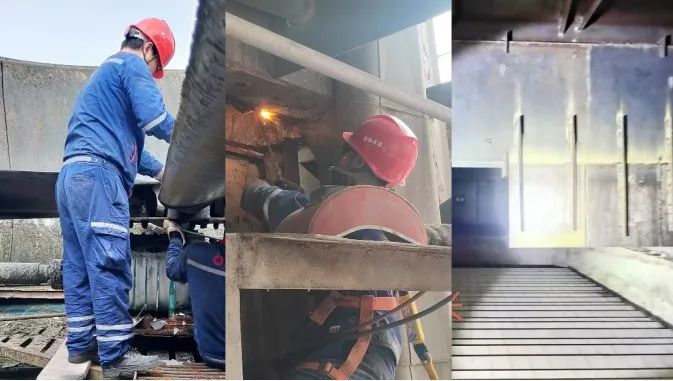 面对今年篦冷机技改后,余热发电系统吨熟料发电量较低的情况,公司立即成立攻关小组,对影响因素逐项排查并改善,对循环水池冷却风机叶片角度进行调整,对玻璃钢冷却塔漏风点进行封堵,对凝汽器、前置冷却器等进行化学高压清洗,对内外密封进行优化,把篦冷机旁路挡风墙向篦冷机尾部移位,并将挡风墙异形设计(比计划中的改管道减少投资70万元)。通过一系列技改项目实施,吨熟料发电量提高了3kWh/t,年收益可达120万元。