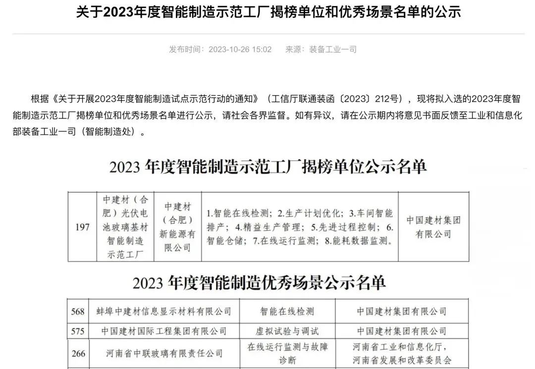 近日,国家工信部2023年度智能制造试点示范行动公示名单正式揭晓,凯盛科技所属中建材(合肥)新能源有限公司入选2023年度智能制造示范工厂揭榜单位,中国建材国际工程集团有限公司、蚌埠中建材信息显示材料有限公司、河南省中联玻璃有限责任公司3家企业入选智能制造优秀场景名单。