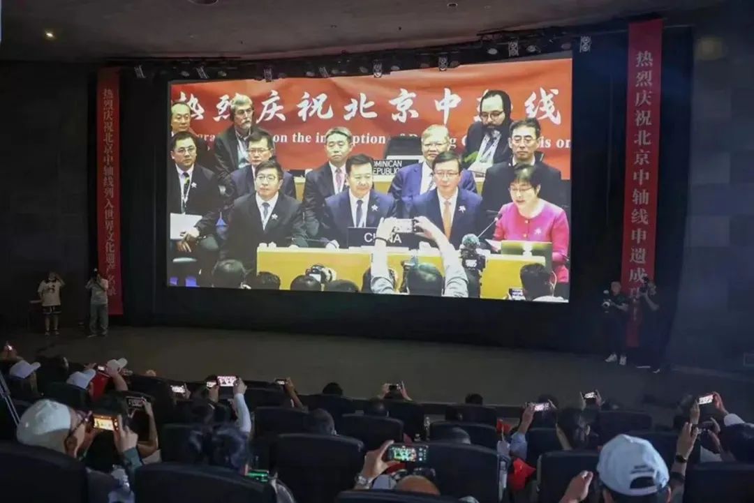 在中华世纪坛、钟鼓楼广场和中轴线基金会秘书处分别举办了北京中轴线申遗成功群众庆祝活动,专家学者、北新建材相关负责人等在中华世纪坛观看第46届世界遗产大会实况视频,共同见证北京中轴线列入世界文化遗产名录的历史性时刻。