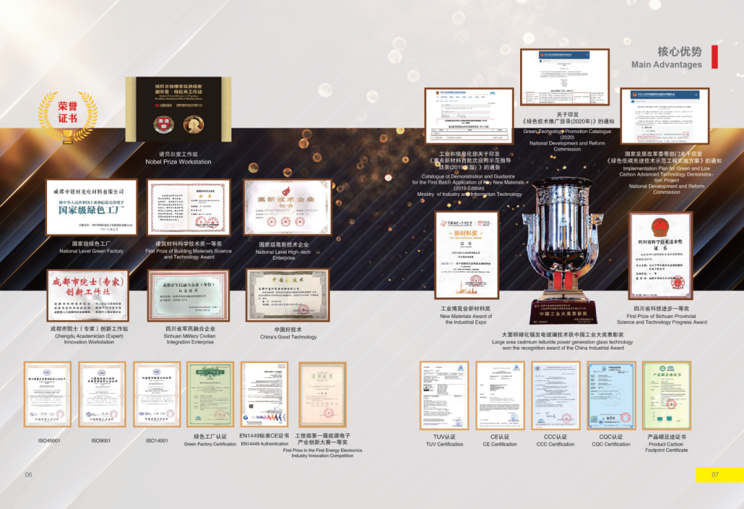 在凯盛科技集团的战略引领下,2017年,世界第一块大面积(1.92㎡)碲化镉发电玻璃在成都中建材光电材料有限公司成功下线,一举填补了国内技术空白,打破了国外垄断,使中国成为首个拥有大面积碲化镉发电玻璃的国家,开辟了“有光就有电”的新纪元。2024年6月,瑞昌中建材光电材料有限公司生产的碲化镉发电玻璃经国际权威认证机构TÜV NORD(德国技术监督协会)认证,单片功率突破至339.91W,转化效率达17.7%,创造了我国大面积(1.92㎡)碲化镉发电玻璃转化效率最新纪录,引领碲化镉产业界新的技术潮流。