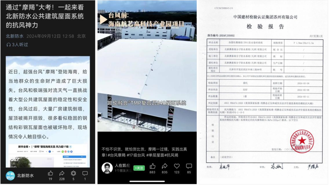 国检集团苏州公司长期致力于建筑屋面系统安全领域检测服务,通过苏州公司抗风揭测试的北新澳泰高分子防水系统(天津)有限公司等企业的产品经受住“摩羯”考验,风灾过后依旧保持着较为完整的功能性。