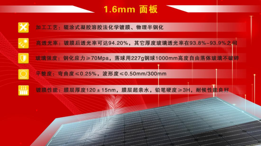 1.6mm原片玻璃具有更高的透光率,原片透光率可达92%。通过采用纳米级超亲水镀膜材料单层镀膜后,整体透光率增加2.1%左右,玻璃透光率可达94.2%,使组件功率可提升2.1%左右。