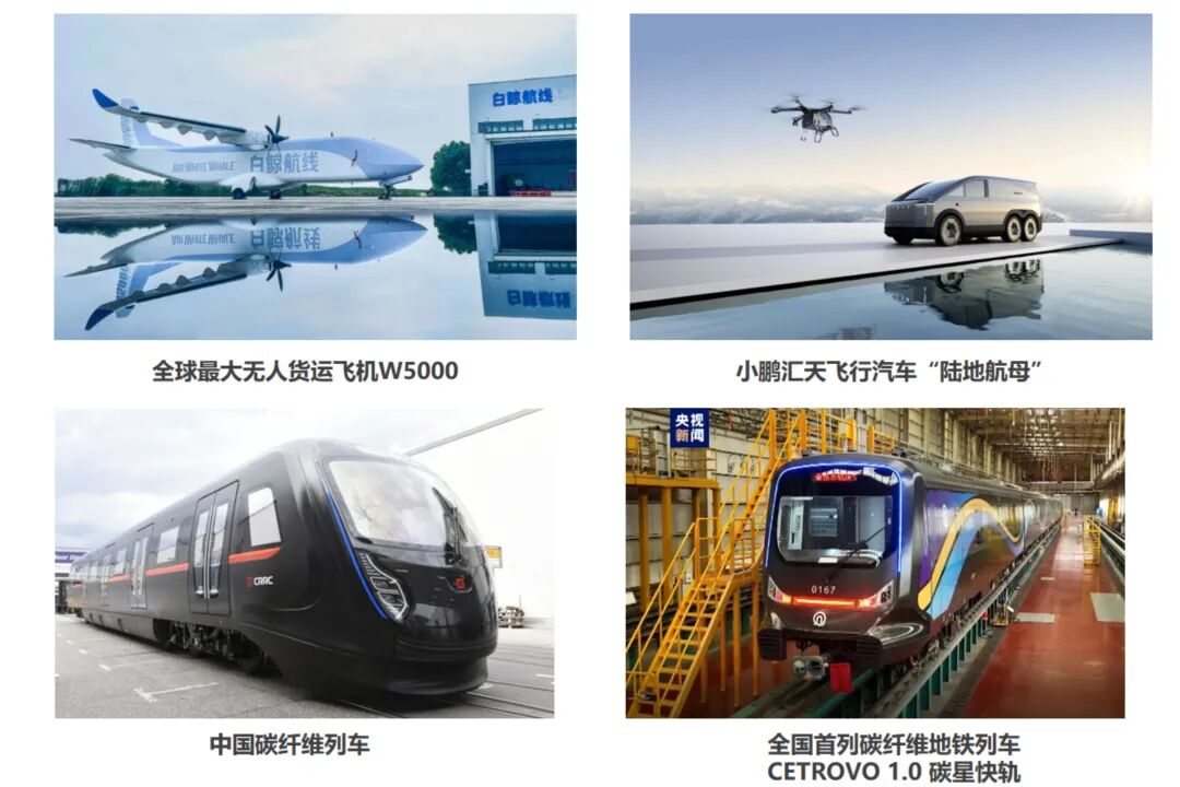 在交通领域,碳纤维正在重构“出行效率”的天花板。商用航空方面,中复神鹰的SYT59G-12K碳纤维通过中国商飞预批准,自研的T800级预浸料Y603成为国产大飞机备份供应商,能帮助飞行器减重15%,大幅提升燃油效率;低空经济领域,中复神鹰的SYM40等产品助力全球最大无人货运机W5000起飞——这款飞机85%的重量来自碳纤维,总重仅2.1吨,载重与航程双双突破;轨道交通中,全国首列碳纤维地铁列车使用中复神鹰的SYT49S-12K碳纤维,既减轻车身重量,又提升抗冲击性;新能源汽车领域,小米SU7 Ultra的碳陶制动盘、比亚迪仰望U9的车身部件,背后都是中复神鹰的碳纤维支撑。