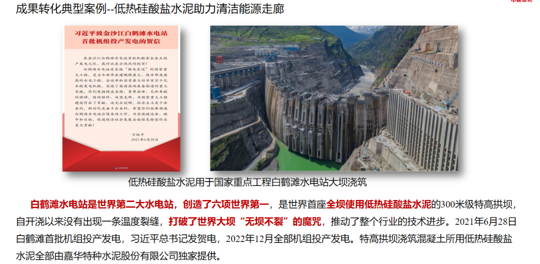 公司研发的低热硅酸盐水泥助力清洁能源走廊建设,成功应用于白鹤滩水电站和乌东德水电站,打破了世界大坝“无坝不裂”的魔咒,推动了整个行业的技术进步。公司定制的G级油井水泥被“海洋石油981”深水钻井平台选定为固井专用油井水泥,打破国外油服公司的技术垄断,从而保障深水油气资源高效安全开采。