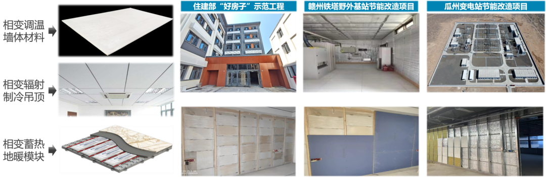 通过二次封装技术,相变材料已实现建材化,产品形式包括:装饰一体化相变调温板材、相变辐射制冷吊顶系统、相变蓄热地暖模块等。应用案例包括住建部“好房子”示范工程CCB建融家园装修改造项目、赣州铁塔野外基站节能改造项目、瓜州变电站节能改造项目等。在河南某办公楼地暖相变蓄能改造项目中,节能率达20%,通过峰谷电套利年省电费达55%。