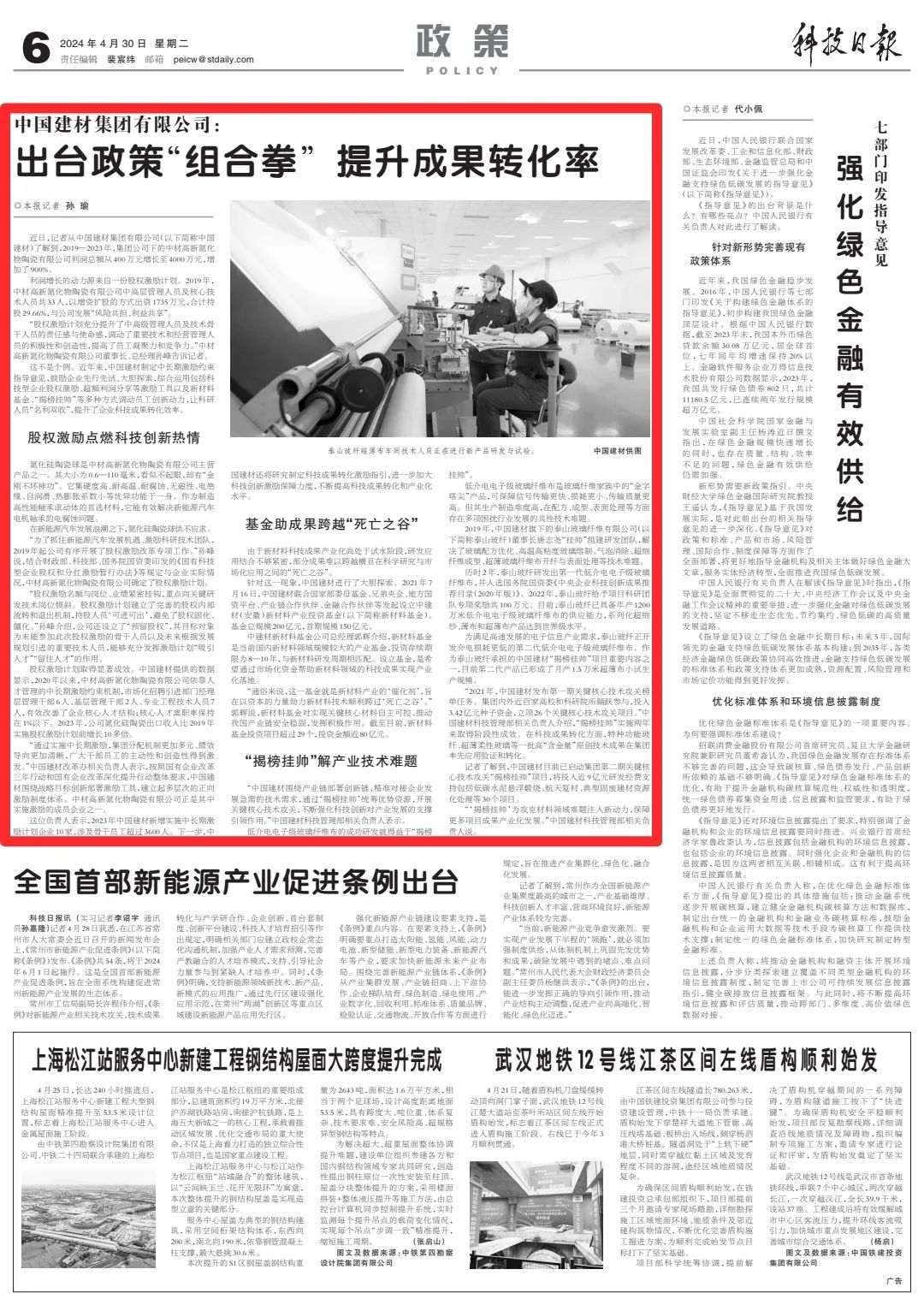 《科技日报》 | 中国建材出台政策“组合拳” 提升成果转化率