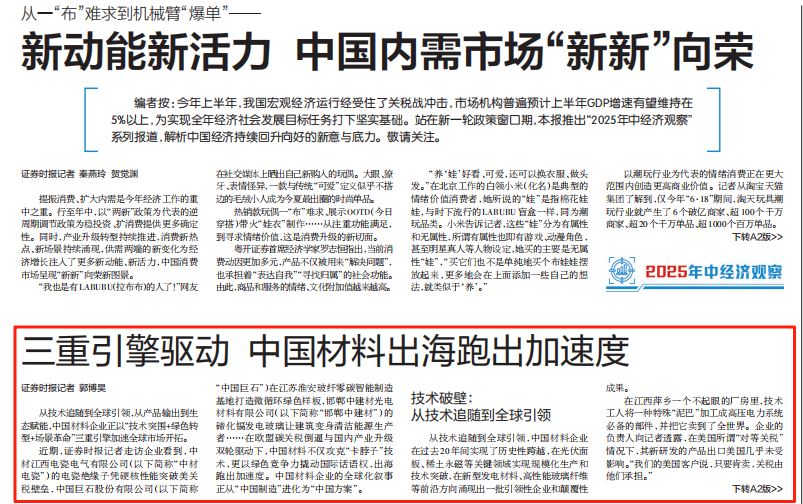 人民日报旗下证券时报刊发《三重引擎驱动 中国材料出海跑出加速度》一文,讲述中国建材作为材料央企,以“技术突围+绿色转型+场景革命”三重引擎加速全球市场开拓。跟着小料来看看详细内容吧~