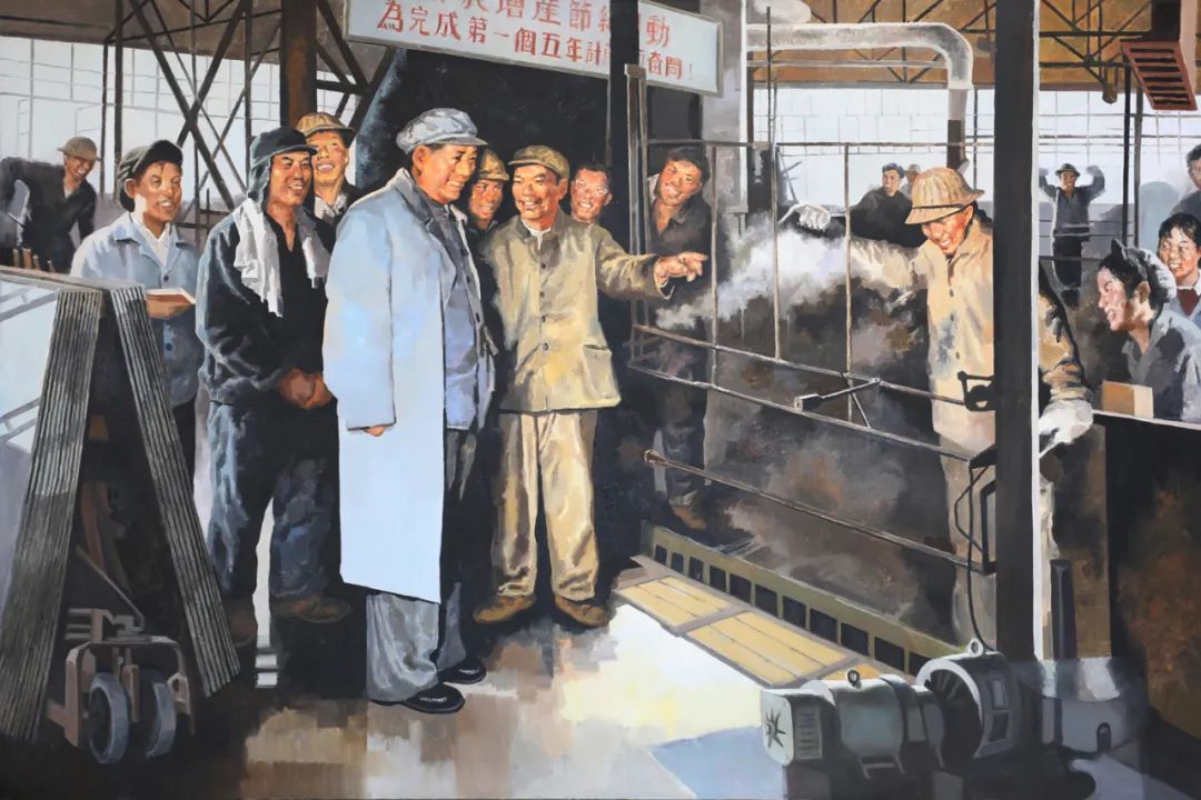 图为根据毛主席视察耀华创作的油画《毛主席视察耀华玻璃厂》