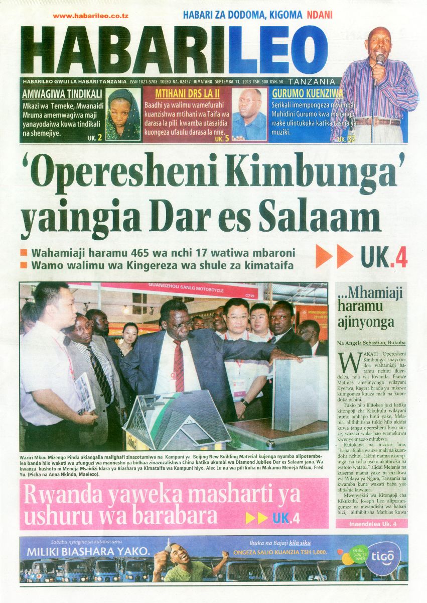 坦桑尼亚政府对此次展会高度重视。坦桑尼亚总理平达亲临北新集团展位,对公司展示产品表示出了浓厚兴趣,详细询问了建材分拨中心及房屋建材产品有关情况。当地媒体对此高度关注。当地主要报纸《今日你好》(HABARI LEO)在头版头条对平达总理参观公司展位进行了报道,其他报纸也以专题形式对此进行了特别关注;当地电视台也对公司展位作了专访。坦桑尼亚贸工部副部长等当地政府官员、当地主要基金会负责人、投资商、建筑商、设计师等纷纷到北新集团展位咨询业务并洽谈合作。