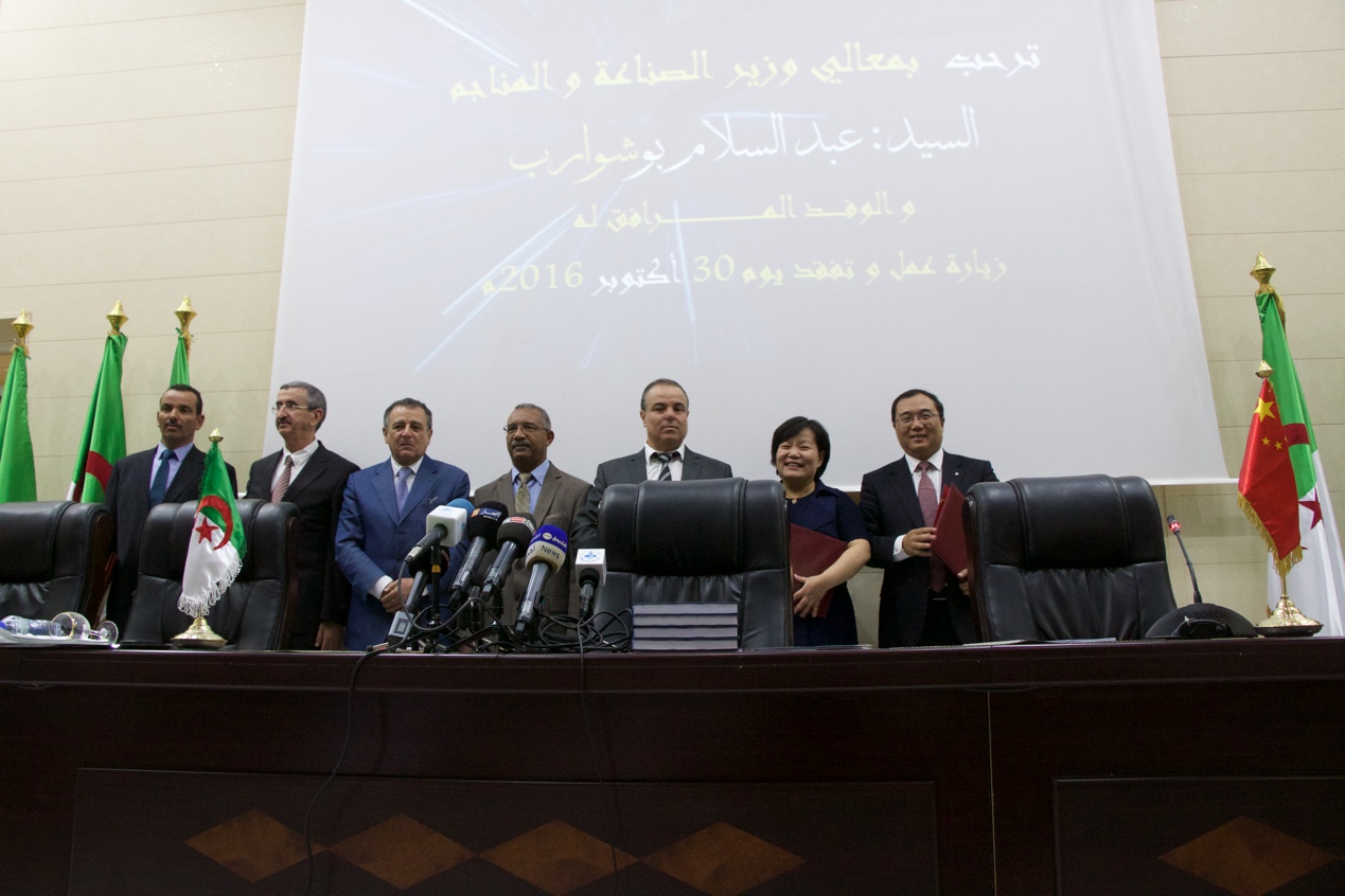 中国建材工程副总裁马明亮、阿德拉尔STG房地产公司总经理MOKHIFI、DIVINDUS总经理MANA及其相关股东代表LINDA在阿尔及利亚工矿业部长BOUCHOUAREB ABDESSLAME、阿德拉尔省省长LIMANI MUSTAPHA、阿尔及利亚国民议会副议长ALI EL HAMEL及其他政府官员、各界人士及记者共200余人的见证下,在有关合作文件上签字。