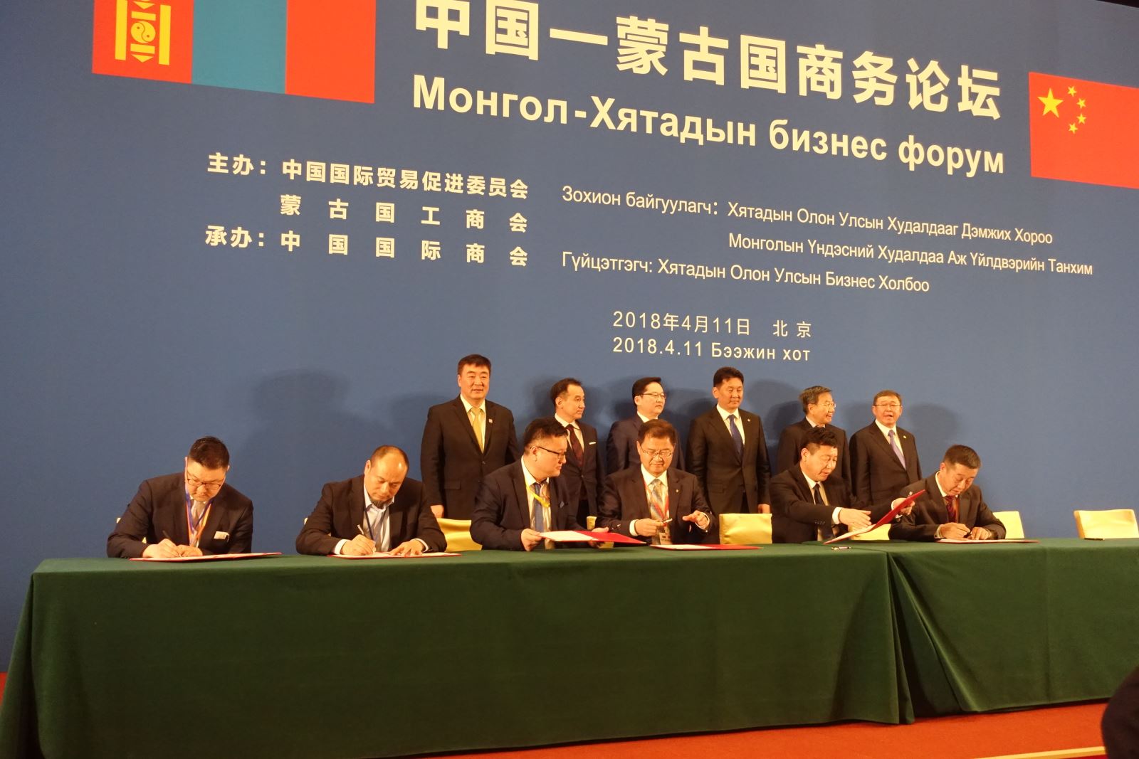 来源:国际合作部 发布时间:2018-04-164月11日,为配合蒙古国总理呼日勒苏赫率经贸代表团访华,促进中蒙经贸交流与合作,中国国际商会在北京钓鱼台国宾馆举办了中国—蒙古国商务论坛。在呼日勒苏赫总理的见证下,中国建材工程与蒙古国Erdes Plazm公司签署日熔化80吨玻璃瓶生产线总承包合同。中国建材工程常务副总裁孙建安与Erdes Plazm 公司总裁BYAMBAJAV代表双方签字。