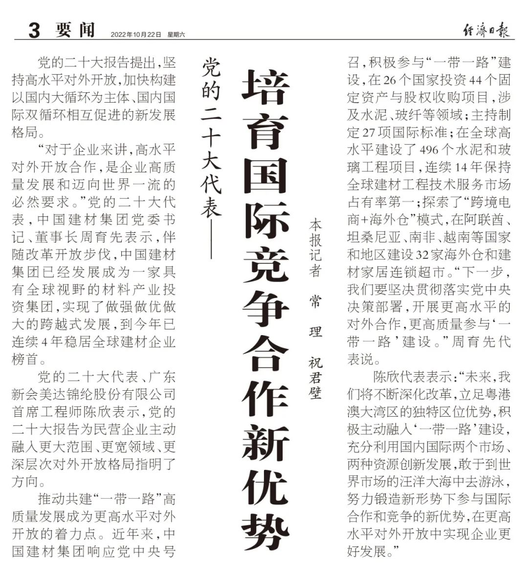 响应党中央号召,积极参与“一带一路”建设,在26个国家投资44个固定资产与股权收购项目,涉及水泥、玻纤等领域;主持制定27项国际标准;在全球高水平建设了496个水泥和玻璃工程项目,连续14年保持全球建材工程技术服务市场占有率第一;探索了“跨境电商+海外仓”模式,在阿联酋、坦桑尼亚、南非、越南等国家和地区建设32家海外仓和建材家居连锁超市。“下一步,我们要坚决贯彻落实党中央决策部署,开展更高水平的对外合作,更高质量参与‘一带一路’建设。”周育先代表说。 多家媒体对周育先代表进行访谈 在中国新闻社《破题新时代人才“考卷” 代表有话说》中说道: 中共二十大代表,日韩无码