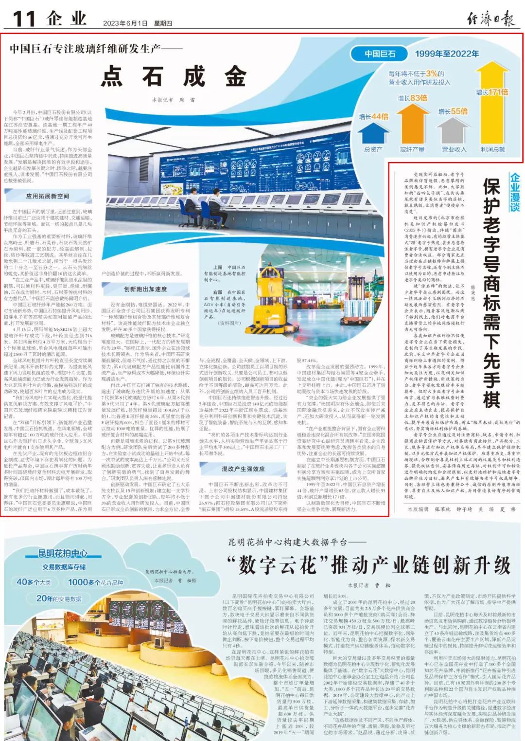 给予的充分信任下,抓住先机,牢牢把握新一轮科技革命和产业变革的大势,向数字化、智能化方向优化升级,在智能制造方面取得优异成绩。 中国青年报 国产玻纤“隐形巨头”成长记 (扫码阅读原文) 中国巨石智能制造基地1000多亩的土地上,一年可以产出 60 万吨粗纱、22 万吨细纱和8亿米电子布,电子布的长度可绕地球两圈。中国巨石还将“未来工厂”建设扩大到了外部,促进产业上下游协同发展。如今,中国巨石的智能制造等先进玻纤生产技术已从桐乡总部推广至成都、九江、埃及苏伊士以及美国南卡罗来纳州。中国巨石还打通了生产制造与企业经营的数据链,通过高标准建设行业工业互联网平台,实现产品生命周期、生产经营的全领域的数字化管理。 工人日报 这些年,国企改革带来新变化 (扫码阅读原文) 从1993年成立,建起第一座中国人自己设计的玻璃纤维池窑,到打破国外长期技术垄断,实现全球市场占有率四分之一,巨石一路弯道超车,成为世界规模最大的玻璃纤维制造商。如何创造这份奇迹?中国巨石给出了答案。 中国证券报 实探中国巨石“未来工厂”建设 (扫码阅读原文) 中国巨石推动‘数字技术+制造技术’融合发展,深化‘产业大脑+未来工厂’建设,引领玻纤工业数字化变革,目前已实现“热固粗纱、热塑增强、电子基布”三个“全球第一”目标,为世界玻纤工业发展树立了一座新标杆。2023年又开启了打造全球首个玻纤零碳智能制造基地的新征程。 “现代新国企”是怎样炼成的 (扫码阅读原文) 在中国巨石未来工厂里,每天生产的玻纤纱能绕地球450圈,工厂自动化率超98.5%,大大提升人均生产效率,远超行业平均水平。 第一财经 混改赋能、重组质变: 三年改革为国企带来新变化 (扫码阅读原文) 中国建材积极探索差异化管控新模式,在允许范围内给予中国巨石最大的经营自主权,在“放活”的同时注重“管好”,确保效率提升,确保风险可控。中国巨石尝试探索建立高效的治理架构,探索实施超额利润分享等中长期激励机制……市场化、灵活、信任的“混合”使得中国巨石活力越来越强。 国有资产管理杂志、环球网 “走进新国企·改革赋能新发展”采访活动走进中国巨石 (扫码阅读原文) (扫码阅读原文) 国有资产管理杂志、环球网刊发《“走进新国企·改革赋能新发展”采访活动走进中国巨石》。1999年至2022年,混合所有制改革助力中国巨石经营质量和经营业绩实现跨越式增长,成为了国家混合所有制的典范。迈入新时代,巨石产品研发瞄准市场前沿,不断优化产品结构,以创新布局高端应用领域;把握科技革命大势,全力赋能智能制造,引领玻纤工业数字化变革;国际拓展,打造高质量发展的海外“增长极”;强化绿色生产过程,完善绿色设计理念,实现可持续发展。