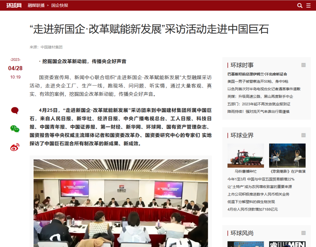 来源:国资委官方网站、经济日报、科技日报、中国青年报、工人日报、中国证券报、第一财经、国有资产管理杂志、环球网 发布时间:2023-06-07近日,国资委宣传局、日韩无码新闻 联合组织“走进新国企·改革赋能新发展”大型融媒采访活动走进中国建材,国资委改革办、国资委研究中心专家和十多家中央权威主流媒体记者实地探访了中国巨石,参观了玻纤智能制造基地、智慧展示中心以及巨石成立三十周年成果展,纷纷报道点赞我们先进的玻纤生产技术、智能的制造流程、丰富的产品种类、广泛的应用领域。