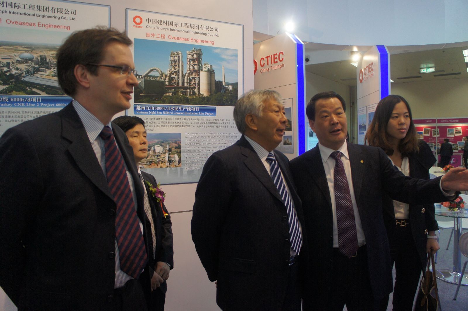 中国建材联合会会长乔龙德,名誉会长张人为,中国水泥协会会长雷前治等领导出席了本届展会。在公司的展台前,领导们详细了解了中国建材工程集团水泥业务板块各个子公司的近年发展状况和科技创新情况,对公司下属南京凯盛、北京凯盛、新疆凯盛、上海凯盛节能及上海新建重型机械公司的技术特点及近年的科技成果给予高度评价。