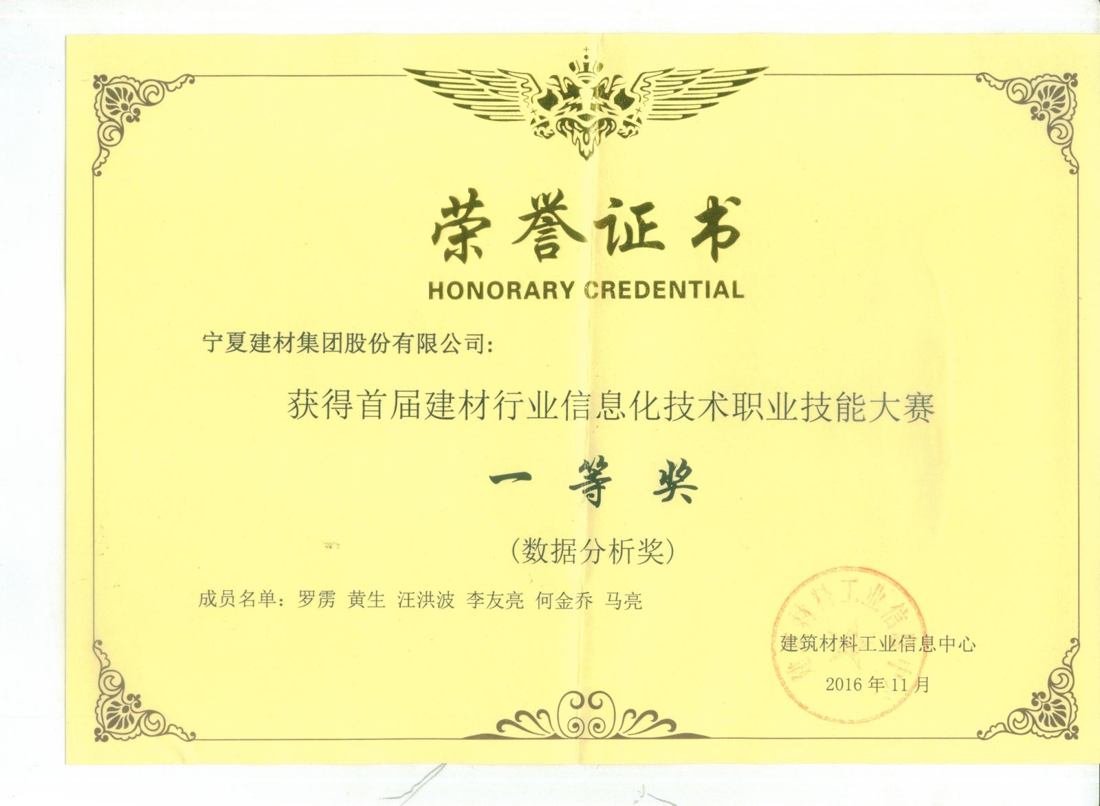 来源:中国中材股份有限公司 发布时间:2016-12-09近日,2016年建材行业两化融合推进大会暨“首届建材行业信息化技术职业技能大赛”颁奖典礼在安徽芜湖举行。宁夏建材参赛作品获得一等奖,宁夏建材总裁王玉林获得“2016年建材行业优秀首席信息官”称号。