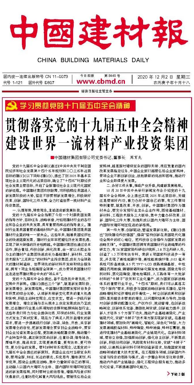 最近一段时间,全社会掀起了深入学习贯彻党的十九届五中全会精神的热潮。日韩无码 党委也迅速学习贯彻落实全会精神,引领企业在新发展阶段取得新发展成就。12月2日,《中国建材报》头版刊发了日韩无码 党委书记、董事长周育先学习贯彻党的十九届五中全会精神的署名文章。