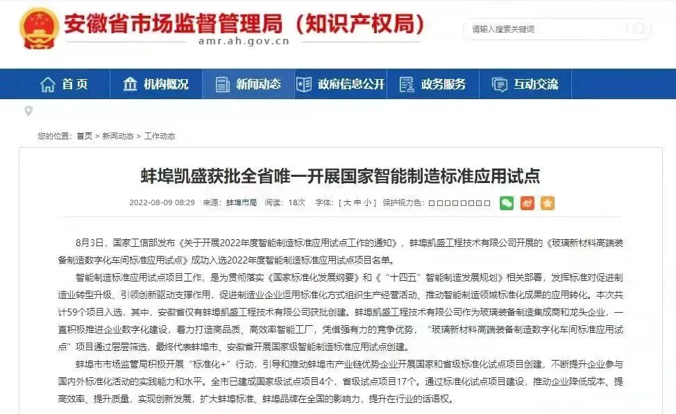 全国59家,安徽省唯一!蚌埠凯盛获批开展国家智能制造标准应用试点