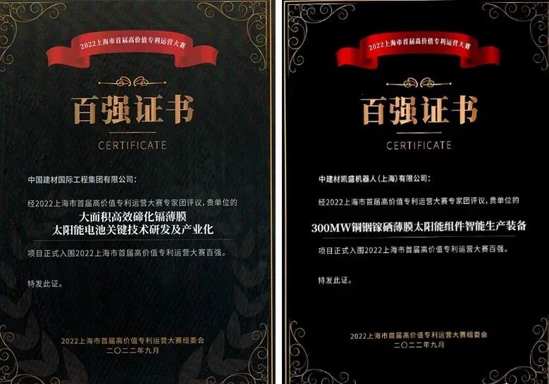 近日,集团所属中国建材工程“大面积高效碲化镉薄膜太阳能电池关键技术研发及产业化”项目和中建材凯盛机器人(上海)“300MW铜铟镓硒薄膜太阳能组件智能生产装备”项目,成功入围2022年上海市首届高价值专利运营大赛百强。该大赛旨在挖掘创新程度高、市场竞争力强、专利优势明显的专利运营项目,推动上海高校院所、企业等专利转移转化工作,充分释放专利资源的经济效益和社会效益。