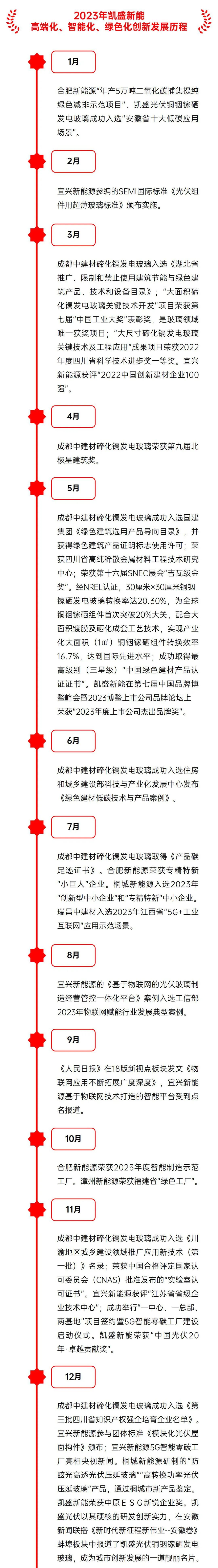 合肥新能源荣获2023年度“智能制造示范工厂”。 瑞昌中建材入选2023年江西省“5G+工业互联网”应用示范场景。 宜兴新能源基于物联网技术打造的智能平台,在《人民日报》18版新视点板块《物联网应用不断拓展广度深度》一文中,受到点名报道。 凯盛光伏铜铟镓硒发电玻璃在《人民日报》第18版产经观察·传统产业新模样板块《建筑业转型升级展新姿》一文中,受到点名报道。 中央广播电视总台新闻频道以“追‘光’逐‘链’:集聚绿色发展的新质生产力”为题,报道了宜兴新能源在光伏行业“5G智能零碳工厂”创新发展成果。 绿色化